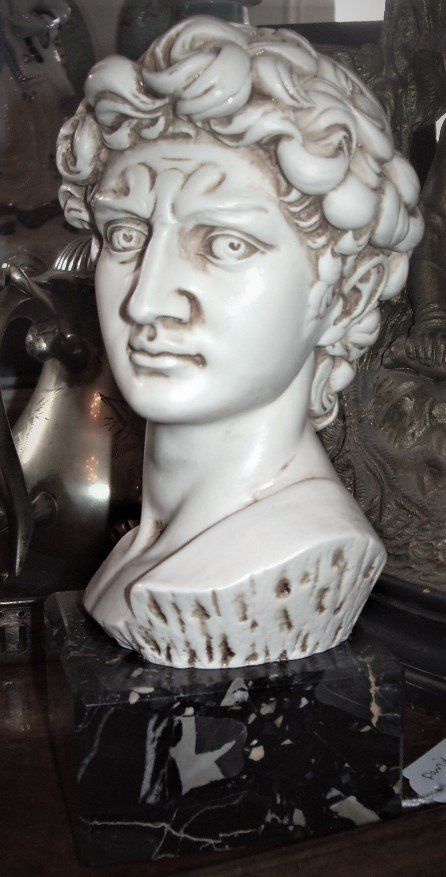 Bust of David. Made of resin and set on freestone. Good quality, heavy piece. H. 15 cm. With signature. Price euro 175