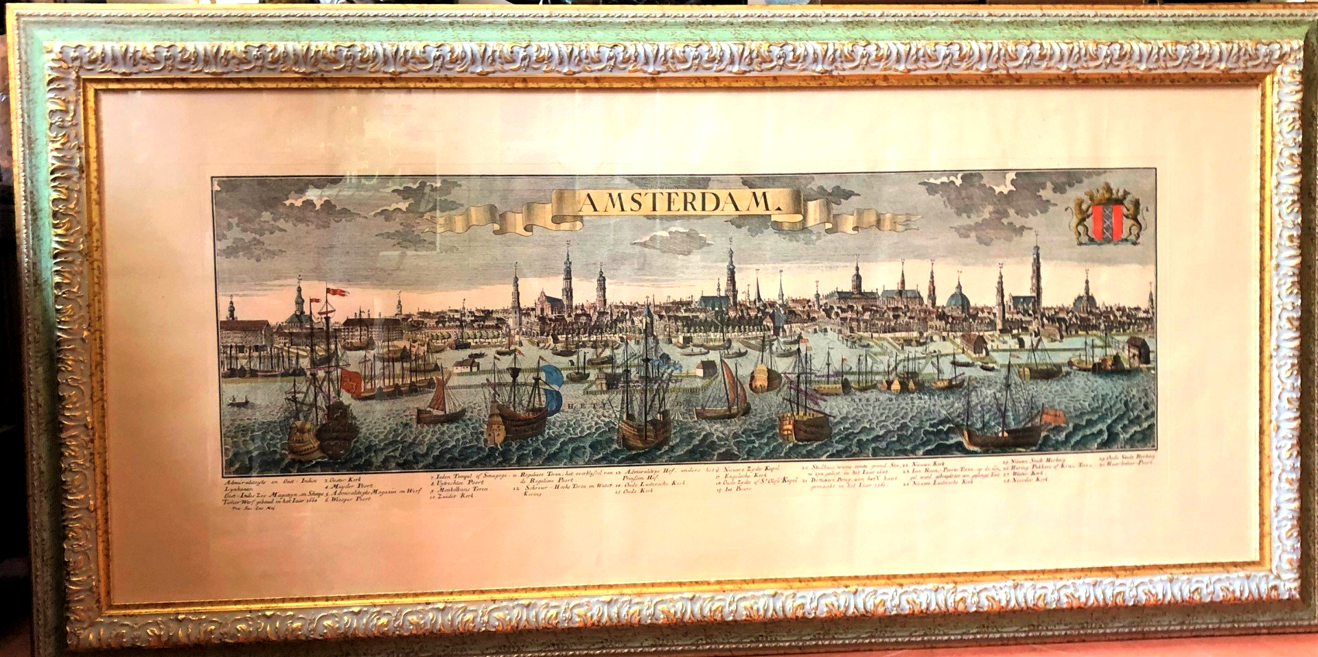 Very large, impressive copper engraving, depicting the cityline of Amsterdam in VOC time around 1600 AD. WIth the City's weapon crest upper right. Numbered '26', lower right side. Behind glass in a modern frame. Made +/- AD 1930. Measurements 134 cm x 67 cm (wooden frame). Price at request.