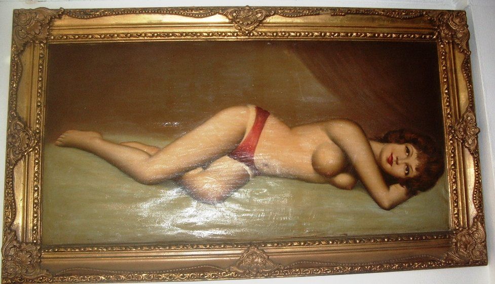 Large oilpainting (1.45 m x 80 cm) on canvas in antique wooden Barok pictureframe. Has some wear and tear due to age. Probably period 1920 -1935. Price at request